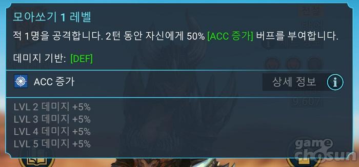다만, 스킬에 붙어있는 디버프는 다르다. 디버프의 확률이 100% 더라도 상대의 RES에 의해 확률이 떨어지게 되는데, 디버프의 적중 확률을 높이는 것이 바로 ACC이다. 따라서 중요한 디버프를 보유한 챔피언에 한해서만 선택하는 옵션이며, 일반적인 딜이나 힐, 부활 등의 역할을 가지고 있는 챔피언은 신경 쓰지 않는다.