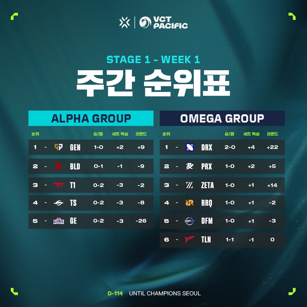 5대5 대전형 캐릭터 기반 전술 슈팅 게임 '발로란트'의 개발 및 유통사인 라이엇 게임즈(한국 대표 조혁진)는 젠지와 DRX가 지난 6일(토)부터 9일(화)까지 서울 강남에 위치한 코엑스 신한카드 아티움에서 진행된 VCT 퍼시픽 스테이지 1 1주 차에서 승리만을 기록하면서 각각 알파와 오메가 조에서 1위에 올랐다고 밝혔다.