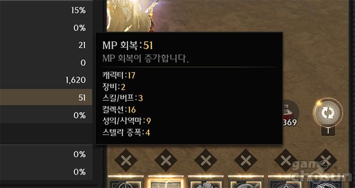 물론 이러한 능력치도 중요하지만, 핵심적으로 눈여겨 보아야 할 것 중 하나는 바로 'MP 회복'이다. MP 회복은 말 그대로 플레이어의 MP가 회복되는 양을 의미한다. MP가 회복되어야만 스킬을 더 많이 사용할 수 있고, 스킬을 더 많이 사용해야 전투에서 우위를 점하고 더 빠르게 사냥할 수 있기 때문에 MP 회복 역시 다른 능력치 못지 않게 중요한 부분이다.