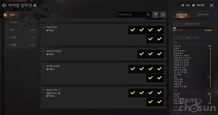 다음은 컬렉션이다. 현재 레이븐2에는 '성의', '사역마', '아이템' 컬렉션이 존재한다. 성의나 사역마는 다소 운적인 요소가 있는 만큼 꾸준히 뽑아주면 자연스럽게 오르는 구조이다. 반대로 아이템 컬렉션은 직접 신경을 쓰는 편이 좋다. 필터링을 통해 MP 회복 옵션을 선택하고 일반/고급 아이템으로 오르는 MP 회복 컬렉션은 명중 다음으로 우선순위를 두고 모으는 것이 좋다. 안전 강화(무기 7강/방어구 5강/ 장신구 1강)까지만으로 투자를 해도 MP 회복 10 정도는 챙길 수 있다.