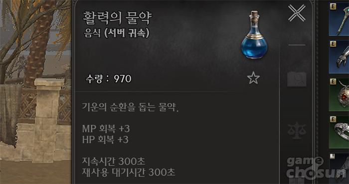 마지막으로 스킬과 버프 아이템을 통해서 올릴 수 있다. 이 부분은 전투 시 자동 적용되는 부분으로 '활력의 물약'은 상시 사용하는 것이 기본이고, 푸른 방어의 비약은 획득 난이도가 있는 음식이기 때문에 상황에 따라서만 사용하는 것이 좋다. 스킬의 경우 MP 회복 옵션을 가진 직업은 한정적이기 때문에 해당 직업만 신경쓰면 된다.