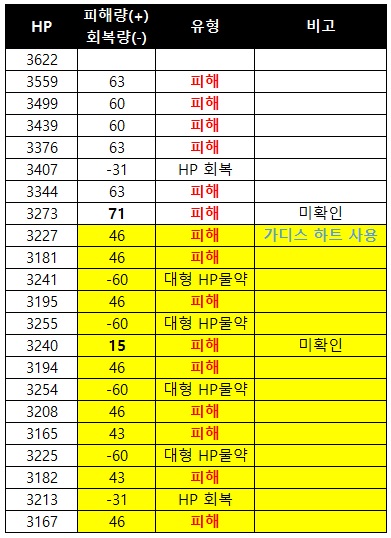 반대로 가디스 하트 사용 이후 체크해봤을 때는 최소 43에서 최대 46의 피해가 들어오는 것을 확인했다. 이는 60~63에서의 수치와 동일한 간격으로 가디스 하트의 최종 피해 내성 '15%'가 피해 감소 17로 적용된 것을 알 수 있었다. 다만 앞서 71의 이상 피해가 있었던 것처럼 15의 피해가 들어온 타이밍이 한 번 있었다.