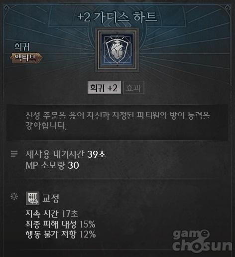 가디스 하트는 영웅 성의 덕분에 2레벨이 상승해 2레벨 가디스 하트를 사용했다. 2레벨 가디스 하트는 지속 시간 17초에 최종 피해 내성 15%, 행동 불가 저항 12%이다.