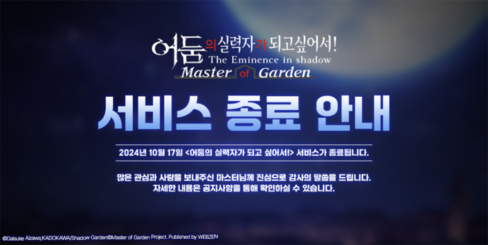 '라그나돌'과 '어둠의 실력자가 되고 싶어서! 마스터 오브 가든' 두 게임은 웹젠이 뮤 IP에 의존하지 않고 새로운 장르에 도전하기 위해 2023년 9월과 10월에 서비스를 시작한 게임이다. 두 게임 모두 출시일 기준 10개월 만에 종료 공지를 공개했고 역시 2개월 후인 딱 1년을 되는 시점에서 서비스가 종료된다. 두 게임 모두 종료 공지가 올라오기 전까진 장기적인 서비스를 준비하는 듯한 업데이트와 공지를 올리고 있었던 것도 동일하다.