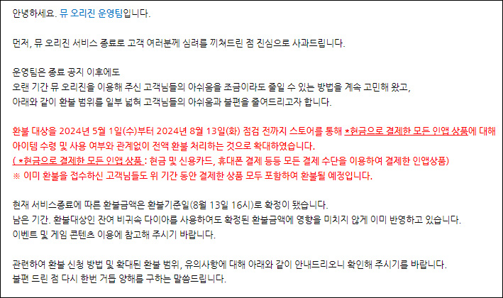이런 뮤 오리진이 8월 13일 갑작스럽게 서비스 종료를 선언했다. 다양한 보상과 새로운 호칭을 획득할 스페셜 이벤트라는 공지를 올린지 불과 하루 후에 올라온 공지다. 종료 공지에는 2달 후인 10월 15일에 게임이 종료한다고 명시했다. 웹젠은 9년 넘게 게임을 즐겼던 게이머들이 불통식 공지에 집단행동을 예고하자 21일 환불 대상 확대를 안내했지만 종료 일시가 변경되는 일은 없었다.