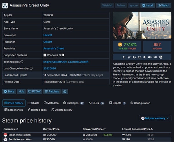 한국의 120원도 충분히 저렴한 가격이지만 다른 국가에서도 비정상적으로 저렴한 가격에 구매가 가능했으며 가장 저렴한 곳은 인도네시아였는데 인도네시아 화폐인 루피아로 해당 게임을 구매할 경우 2.4원에 어쌔신 크리드 유니티를 업어올 수 있었다.