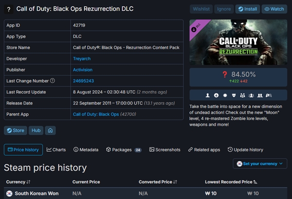'콜 오브 듀티:블랙 옵스'의 4번째이자 마지막 DLC인 '레저렉션'의 경우 스팀 플랫폼의 자국 통화 결제 가격 오류로 인해 피해를 본 케이스다. 15년 11월 스팀에서 달러를 기준으로 환산하던 결제 금액을 한화 기준으로 재설정하는 작업 과정에서 문제가 발생한 탓에 말도 안되는 가격인 10원으로 게임을 구매할 수 있게 된 것이다.