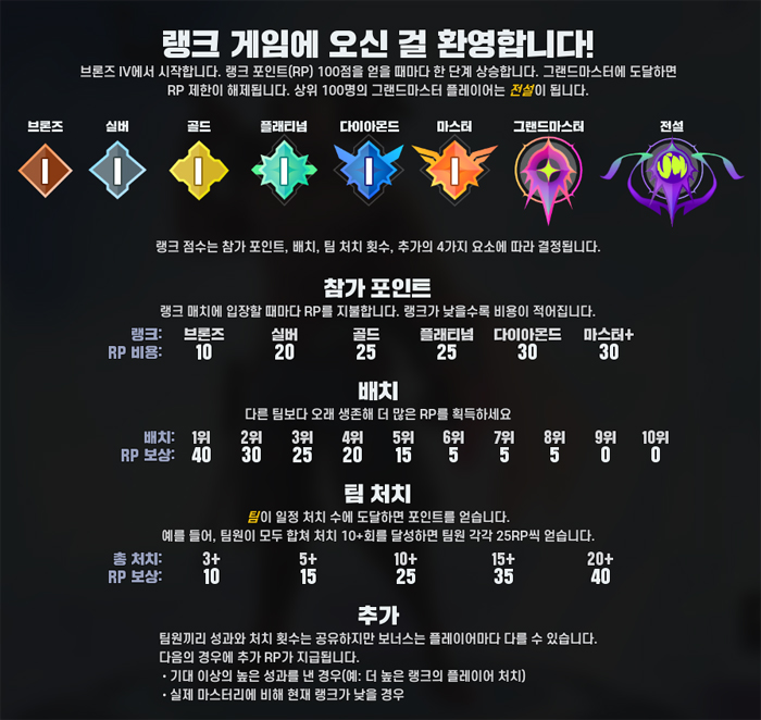 모든 게이머는 랭크 게임 시작 시 등급에 따라 일정 RP를 지급하고 입장하게 되며 게임 내 적 처치, 스쿼드 등수, 적 팀 처치 등 승리를 위한 활동을 할 때마다 RP를 지급받는다. 즉 입장 시 활약없이 패배하면 점수를 잃지만 활약도가 높으면 큰 이득을 볼 수 있다는 의미다.