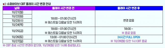 이런 인기를 의식했는지 슈퍼바이브는 지난 24일 공지를 통해 13시 ~ 익일 1시까지로 예정된 주말 테스트 시간을 점검없이 24시간 풀타임으로 진행한다고 밝혔다. 25일 금요일 18시부터 시작해 월요일 오전 1시까지 55시간동안 점검없이 풀타임으로 즐길 수 있다는 의미다.