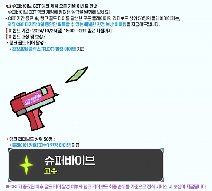 슈퍼바이브는 랭크 게임 오픈을 기념해 이벤트를 진행한다. CBT 기간 랭크 게임에 참가해 골드 티어 이상 달성한 모든 플레이어는 오픈 후 사용할 수 있는 감정표현 '플랙스'를 지급하고 최상위 랭크 50 명에게는 플레이어 칭호 '고수'를 제공한다. 플랙스 감정 표현과 고수 칭호는 모두 CBT 기간 내 랭크 게임에서 획득한 게이머들에게만 지급하는 한정 보상이다.