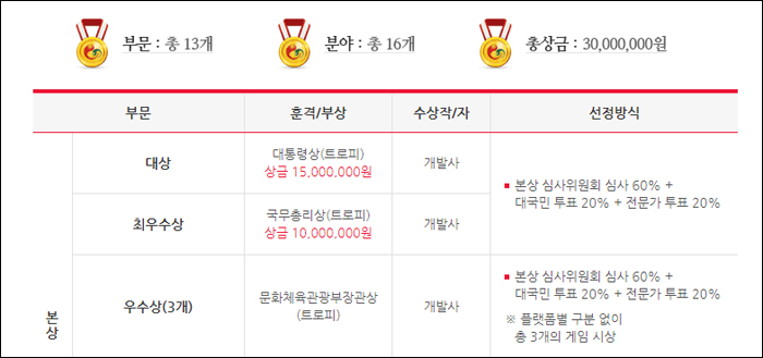 이 중 최고로 꼽히는 대상은 심사위원회 심사 60%, 전문가 투표 20%, 대국민 투표 20% 비율로 선정되며, 전문가는 각 게임들의 작품성, 창작성, 대중성을 고려해 최종 대상을 발표한다. 2024 게임대상을 수상한 게임사는 대통령상 트로피와 함께 15,000,000원 상금이 주어진다.