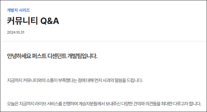 퍼스트 디센던트는 31일 공식 홈페이지 개발자 시리즈 게시판을 통해 '커뮤니티 QnA' 게시물을 게재했다. "소통이 부족해 사과드립니다"로 시작하는 이 게시물은 시즌2를 앞두고 게이머들이 궁금해했던 질문에 답변을 게재한 게시물이다. 하지만 조금 특별한 이유는 그 질문의 수가 50개가 넘는다는 것, 그리고 퍼스트 디센던트라는 게임이 향후 가야할 방향을 답변이라는 형식을 빌어 녹아냈기 때문이다.
