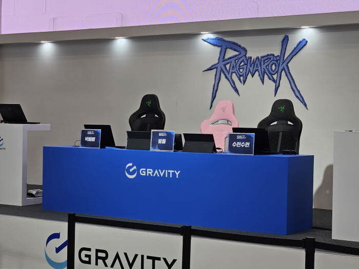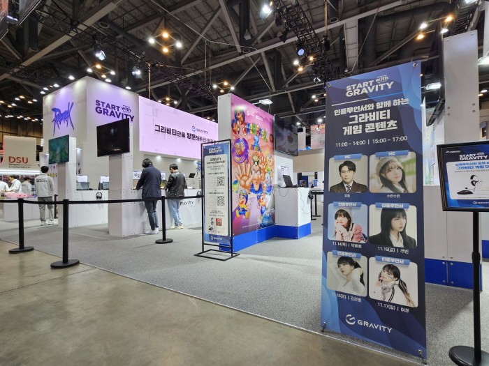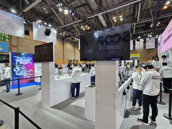 그라비티 부스는 17종의 게임을 공개함에도 부스 3면을 개방해 넓은 느낌을 주는 동시에 모든 게임을 시연할 수 있는 시연대로 갖추고 있다. 여기에 자사 게임 브랜드를 알리는 다양한 전시물들도 있지만 시연대, 전시물 사이의 공간을 넓직하게 구성해 답답함을 주지 않는 구조다. 특히 부스 상단 전면을 장식한 전시 게임들은 작은 공간을 최대한 넓히면서 효율적으로 이용했다는 인상을 준다.
