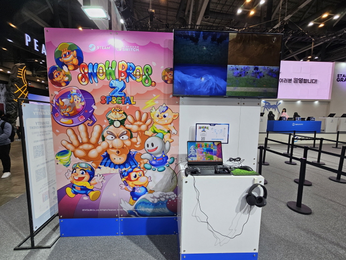 부스 정면은 하얀색 그라비티 로고와 함께 이번 행사에서 가장 강조하는 타이틀로 채워져있다. '라그나로크3', '프로젝트 어비스(가칭)', '스노우 브라더스2 스페셜', '라그나로크 크러쉬' 4종의 게임은 벡스코 1관 입구에 위치한 부스 특성상 가장 많은 입장객들의 눈에 띄일 것으로 예상된다.
