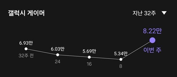 한국의 경우 11일 기준 이용자가 가장 높은 구글스토어 매출 순위 3위를 기록 중이다. 갤럭시 게이머 기준 접속자 수는 8.22만을 기록했다. 한 주전 기록이 5.34만인걸 감안하면 무려 53%가 증가한 수치다. 각종 모바일앱데이터를 기록하는 모바일인덱스 기준 추정 국내 일일 접속자는 20만 명에 육박한다.