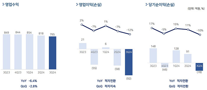 펄어비스(대표 허진영)가 12일 실적 발표를 통해 2024년 연결 기준 3분기 매출 795억원, 영업손실 92억원, 당기순손실 78억으로, 매출은 전년동기 대비 6.4% 감소했고 영업이익, 당기순이익은 주요 IP 매출 감소, 마케팅 비용 등 일외성 비용 증가로 인해 적자를 기록했다.