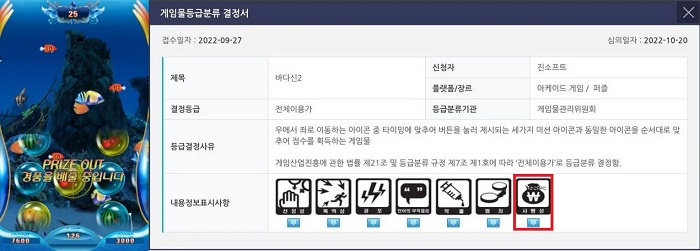 오히려 게임업계에서 사행성 게임을 연상케 한다고 금기시되던 진소프트 '바다신2'와 같은 게임에 대해 심의거부로 일관하는 것이 아니라 전체이용가로 등급이력을 통과시켜주는 포용력을 보여주기도 했는데요.