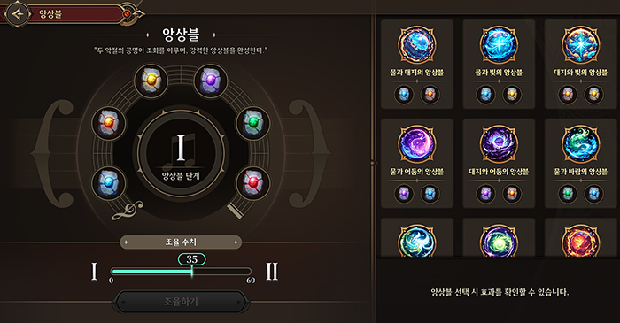 두 가지 속성을 조합하여 특별한 효과를 갖게 되며, 조합 가능한 앙상블 개수는 총 12개입니다. 빛과 어둠 같은 역상성 조합은 불가능합니다.