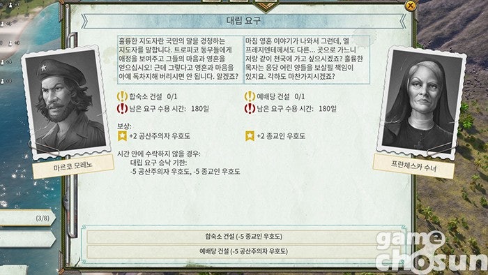 트로피코 6에는 자본주의자, 공산주의자, 종교인, 군국주의자 등 다양한 세력이 등장합니다. 이들은 정기적으로 자신들에게 필요한 건물, 공산주의자라면 작업자들이 쉴 수 있는 합숙소를 요구하고, 종교인이라면 신앙을 위한 예배당을 건설해달라고 요구합니다. 이를 수행하면 보상으로 돈이나 우호도를 선물하죠. 가끔은 이들이 서로 대립되는 요청을 던져 둘 중 하나만 골라야 하는 경우도 있습니다. 이 경우 선택받지 못한 세력은 대통령에게 반감을 가지게 되죠.