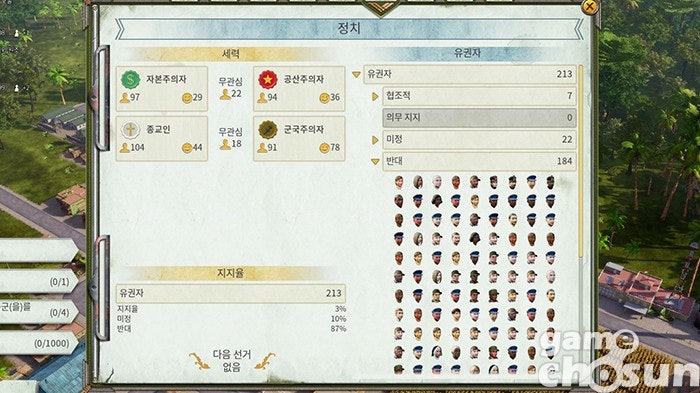 독재자라면서 왜 이렇게까지 해야 하는 걸까요? 선거에 당선돼야 하니까요! 불법적인 일을 할 수 있어도, 무소불위의 권력을 가지고 있어도, 결국 그 권력은 시민들에게서 나옵니다. 시민들이 늘어날수록 국가는 점점 힘이 생기고, 게이머는 그 힘으로 국가를 운영할 수 있죠. 그렇기에 그들의 요구를 무시하고 정말로 마음대로 했다간 다음 선거에서 낙선하고 게임 오버 화면을 보게 됩니다.