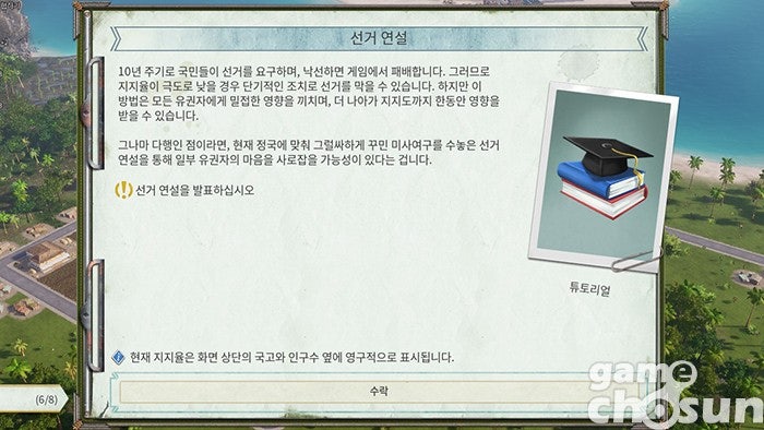 그런데 트로피코 6는 이 장르 대표작인 심시티나 시티즈 스카이라인과 비교하면 꽤 특이한 부분이 있습니다. 바로 '독재자'죠. 게이머는 트로피코의 독재자가 되어 나라를 운영하게 됩니다. 그래서 기존 건설 경영 시뮬레이션에 비해 정치와 외교 파트가 굉장히 중요하죠. 만약 10년에 한 번씩 열리는 선거에서 떨어지게 되면 그대로 게임 오버가 됩니다.