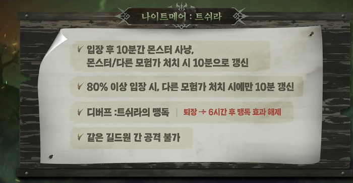 PvP와 PvE를 결합한 신규 콘텐츠 '나이트 메어: 트쉬라'도 추가한다. 해당 콘텐츠는 드라간 지역의 트쉬라 폐허를 배경으로 하고 있는데, 드리간의 용맹한 전사 셰레칸에 의해 큰 상처를 입은 검은 용 마크타난의 피가 쏟아진 뒤로 저주받은 땅이 됐고, 독연이 깔린 곳에는 기이한 생명체들이 모여들어 위험한 지역이 됐다. 옛 셰레칸의 전사들이 사용하던 전승의 고리를 얻을 수 있다는 이야기가 퍼지며 모험가가 모여드는 지역이라는 설정이다.