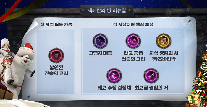 '겨울 숲 로나로스'는 총 5곳으로 늘어나며 '최고급 경험의 서' 획득량도 증가한다. '에레보크'를 소환할 수 있는 '어둑한 겨울 심장'의 획득 확률이 증가하며 심연 및 태고 등급의 '알 수 없는 기억 목걸이' 보상이 추가된다.