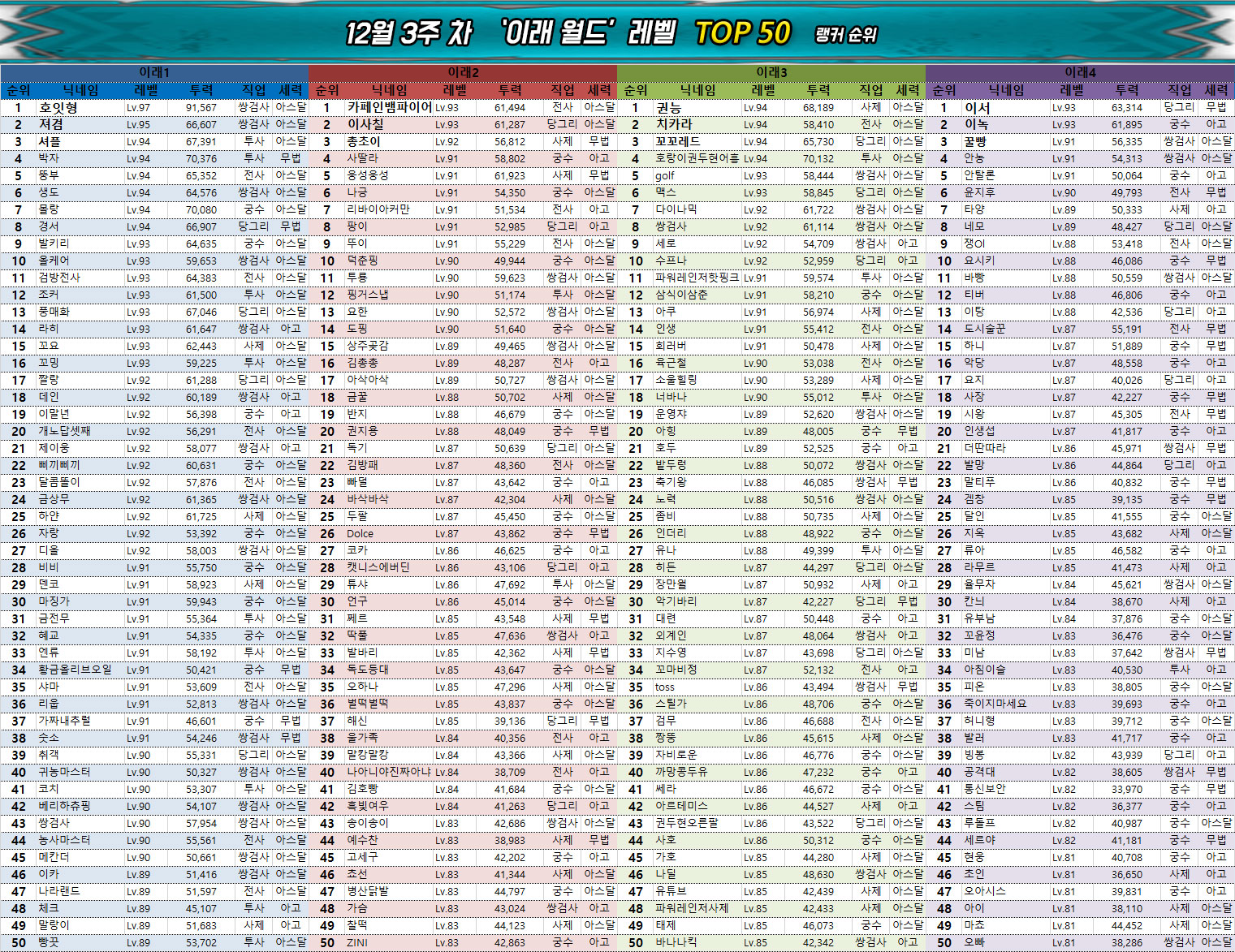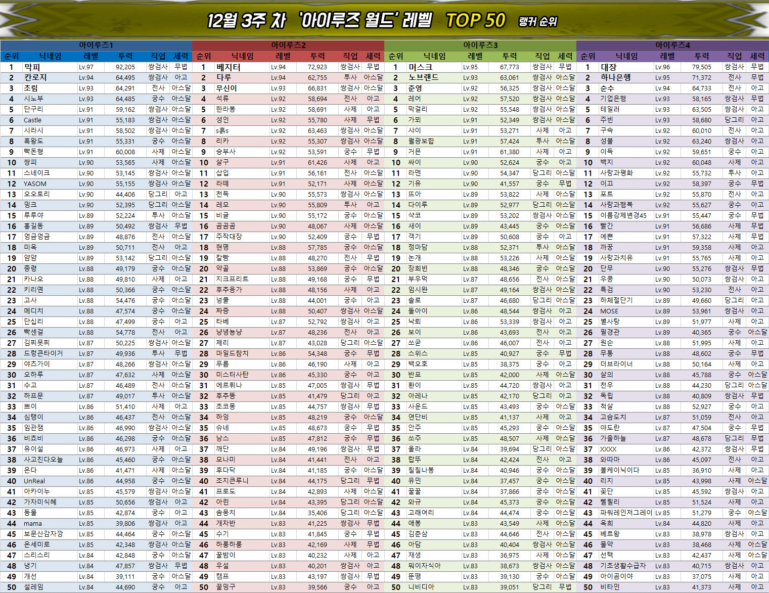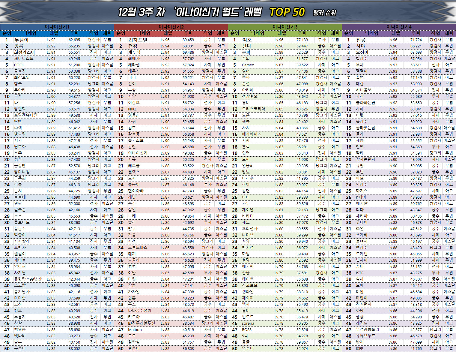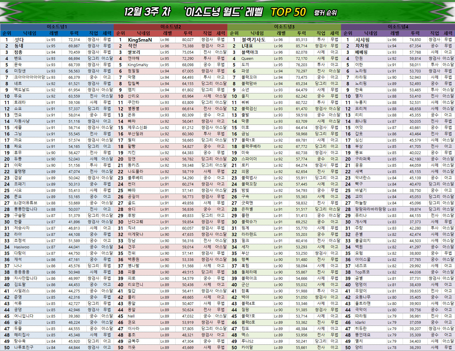 지난주에 이어 이래 월드 1서버 '호잇형'은 금주도 전투력 및 경험치 상승폭이 매우 저조하여 아이루즈 월드 1서버 '막피'에게 3위자리까지 내어준 상태인데, 아직까지 궁수 클래스를 고수하고 있는 '리차드밀'이 최근 9만 전투력 진입을 목전에 두고 뒤를 바짝 쫓으면서 안정-호잇이의 경쟁 구도가 완전히 망가진 셈이 됐다.