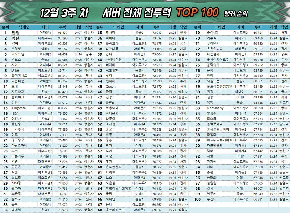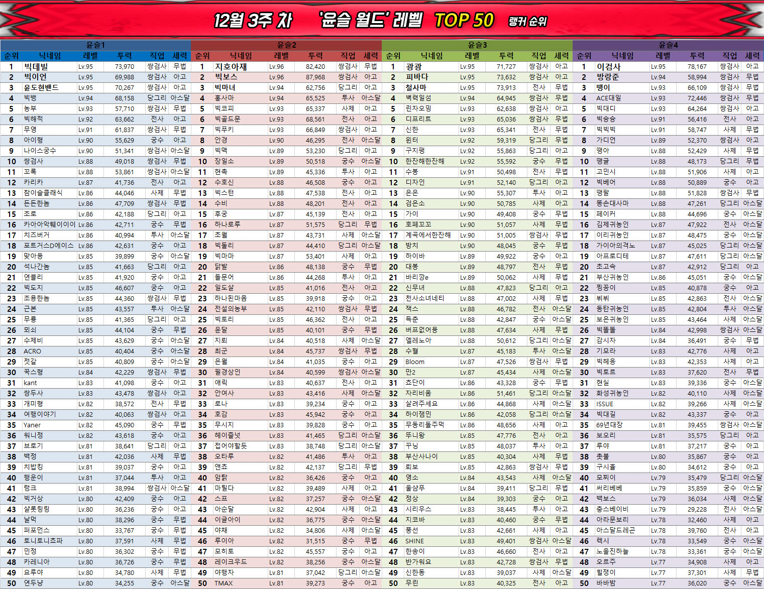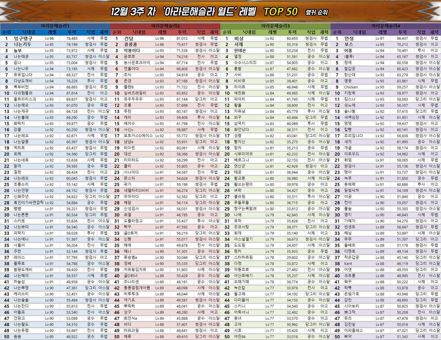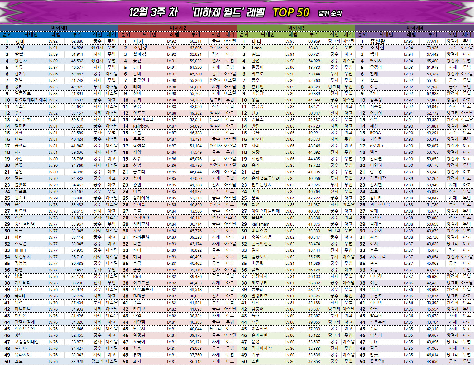 지난주에 이어 이래 월드 1서버 '호잇형'은 금주도 전투력 및 경험치 상승폭이 매우 저조하여 아이루즈 월드 1서버 '막피'에게 3위자리까지 내어준 상태인데, 아직까지 궁수 클래스를 고수하고 있는 '리차드밀'이 최근 9만 전투력 진입을 목전에 두고 뒤를 바짝 쫓으면서 안정-호잇이의 경쟁 구도가 완전히 망가진 셈이 됐다.