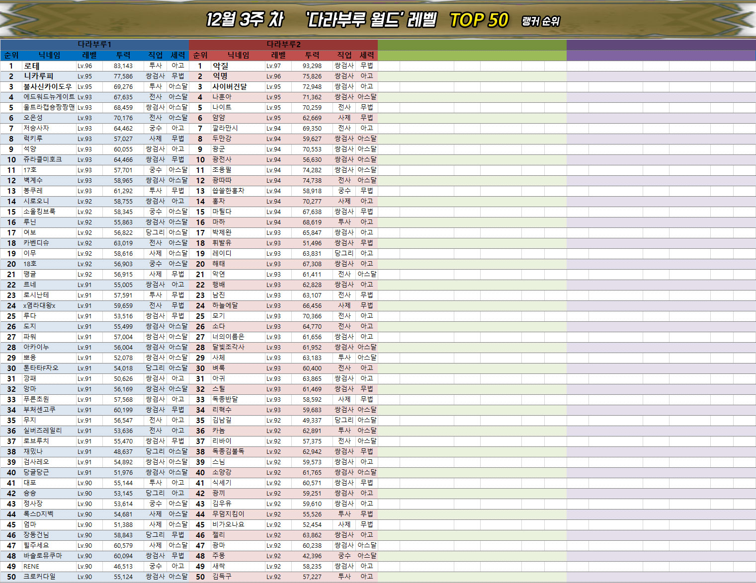 ※ 평균 전투력 및 레벨에서 다라부루1, 2와 에차빕 1, 2의 데이터는 제외되었습니다.