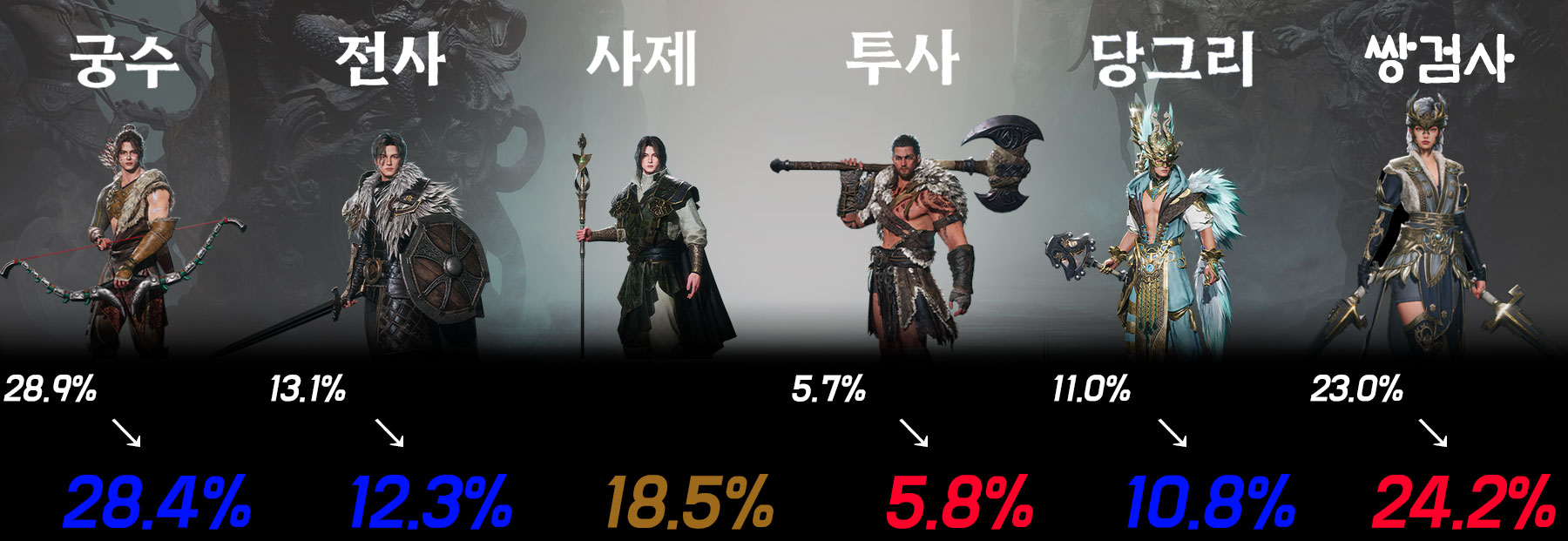 넷마블의 MMORPG '아스달 연대기: 세 개의 세력(이하 아스달 연대기)' 12월 3주차 랭킹에서는 궁수 클래스의 점유율이 점차 데드 크로스를 향해 달려가는 가운데 호잇형(호잇이)의 레이스 이탈이 이슈였다.