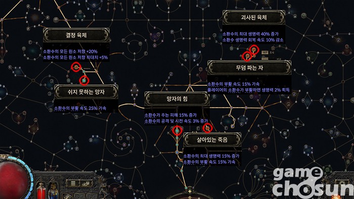 패시브 스킬은 격노의 유령 없이 해골들로 버텨야 하는 초반엔 소환수 부활 속도 가속, 후반엔 소환수 체력 및 저항 능력과 캐릭터 본인 생존을 위한 에너지 보호막 최대치 상승 위주로 찍어준다. 특히 소환수 부활 속도가 필요 없는 격노의 유령 습득 이후론 소환수 부활 속도 가속보단 소환수 딜링과 탱킹 능력에 더 투자하는 것이 좋다.