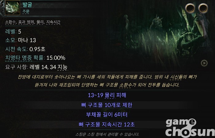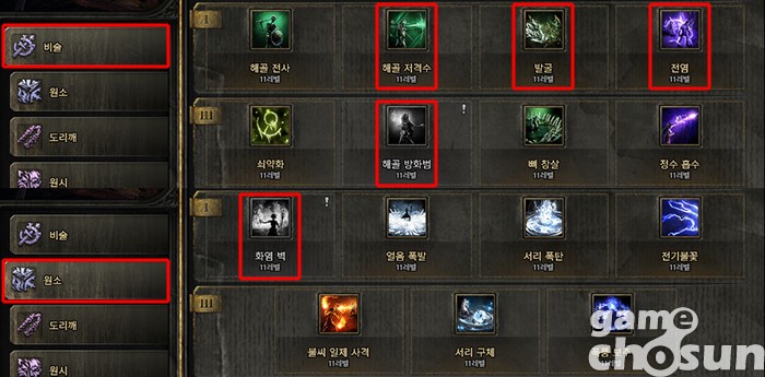 초반에는 셉터 장비에서 얻을 수 있는 '해골 전사 소환수'로 자동 소환되는 해골 전사 2마리, 가스 화살을 사용하는 원거리 소환수 '해골 저격수', 적 시체에서 뼈 구조물을 소환하는 '발굴', 광역 딜링 능력이 탁월한 '전염', 기본 기술로 사용하기 좋은 '화염 벽'을 추천한다.