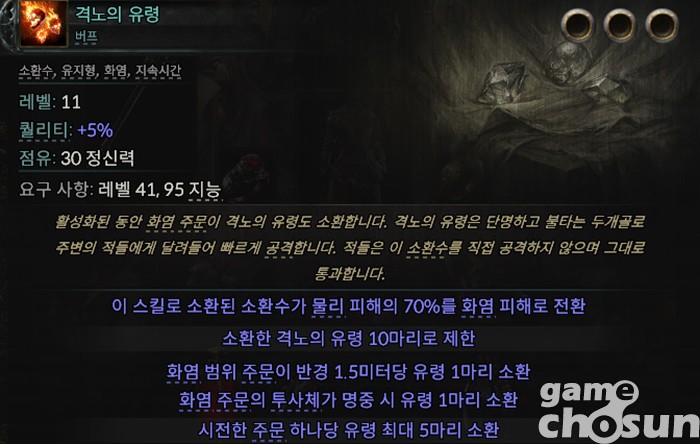 핵심 스킬은 유지형 버프 스킬인 '격노의 유령'이다. 격노의 유령은 화염 주문을 사용 시 '격노의 유령'을 소환(Summons Raging Spirits)하는 스킬이며, 그래서 이 빌드를 SRS 위치라고도 부른다. 초반부터 손쉽게 10마리 이상의 소환수를 부릴 수 있어 안정적으로 전투를 진행할 수 있는 것이 장점이다.