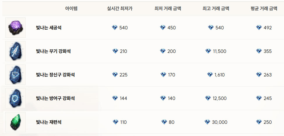 특히 기본 보상의 수준부터 베이스 재료인 조각 수십개가 모여야 하는 '빛나는' 접두사가 붙은 관계로 기존에 형성되어 있던 영웅 등급 강화/성장 재료들은 평균 거래 금액보다 확연히 낮은 최저 거래 금액을 기록하고 있으며 거래소의 유통량도 유의미한 상승곡선을 보이고 있다.