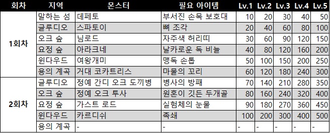 아래는 각 챕터 전리품 도감의 치명타 확률 증가 몬스터 및 재료, 5레벨까지의 수량을 정리한 것이다.