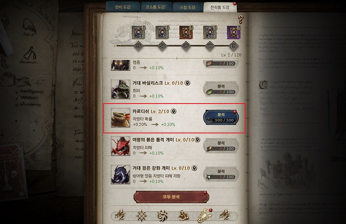 따라서 추가적으로 치명타 확률 증가를 확보해야 하는데, 그 해답은 '전리품 도감'에서 찾을 수 있다. 전리품 도감은 각 지역에서 일반 몬스터를 처치해 획득하게 되는 재료를 일정 개수 이상 등록하면 추가 능력치를 제공하는 시스템이다.