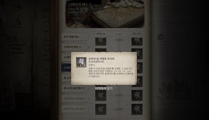 따라서 주사위의 추가 확보가 절실한데, '스테이지 패스3'가 해결책이 될 수 있다. 스테이지 패스3는 기본적으로 스테이지를 100층 씩 돌파할 때마다 200개를 제공한다. 또 해당 스테이지 패스3는 50,000 다이아로 유료 보상을 개방할 수 있는데, 이 경우에 '오만의 탑 이벤트 주사위 (Lucky Dice)' 3개를 추가로 얻을 수 있다.