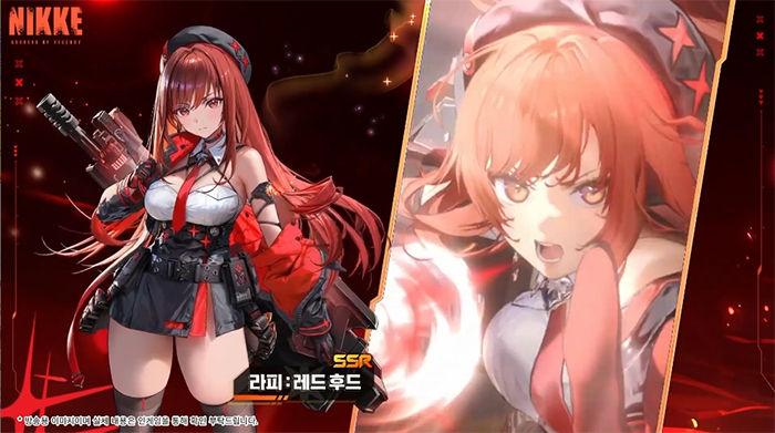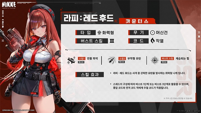 '라피 : 레드후드'는 '3버스트', '화력형'에 '머신건(MG)'를 사용하는 '작열' 코드 니케로 사격 중 강력한 유탄을 발사한다고 하고,