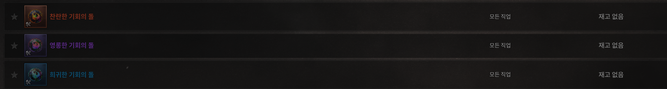 그나마 기회의 돌은 주요 수급처가 파티 던전으로 설정되어 있고 26일 업데이트로 인해 파티 던전에 자동 매칭 시스템 이 도입되어 접근성이 상당히 개선되었기에 시일이 지남에 따라 빠르게 가격 안정화를 기대해볼 수 있다.