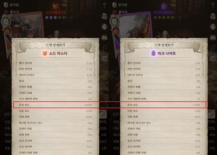 공격 속도 외의 능력치도 동일 레벨 및 성급 기준으로 전설 등급 캐릭터가 월등히 높다. 따라서 미래 투자 효율을 고려했을 때 영웅 등급 캐릭터에 과도하게 투자하는 것보다는 전설 등급 캐릭터에 투자하는 것이 좋다.