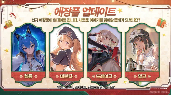 다음으로 크리스마스 특별 방송에서 예고된 바와 같이 애장품 추가 니케로 '헬름', '미란다', '드레이크', '밀크'가 추가됩니다.