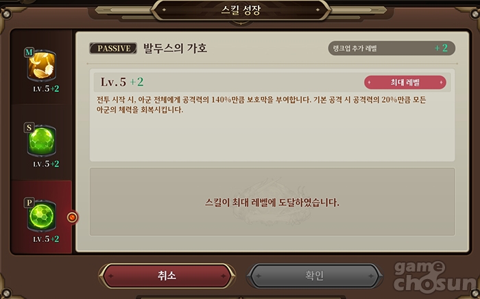 패시브 스킬 '발두스의 가호'는 전투 시작 시 아군 전체에게 공격력의 140%만큼 보호막을 부여합니다. 기본 공격 시 공격력의 20%만큼 모든 아군의 체력을 회복시킵니다.