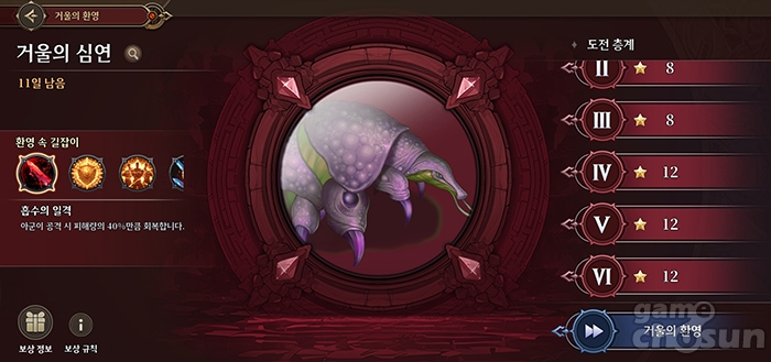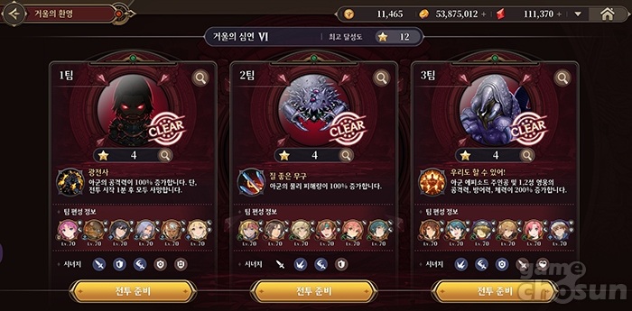 거울의 심연은 최대 3개 파티까지 구성하여 주어진 3개의 스테이지를 연달아 격파해야 하는 가가브만의 특색 있는 콘텐츠죠. 특히, 가장 최근에 출시된 영웅부터 1~2성 영웅들까지 활용할 수 있는 것이 특징입니다.