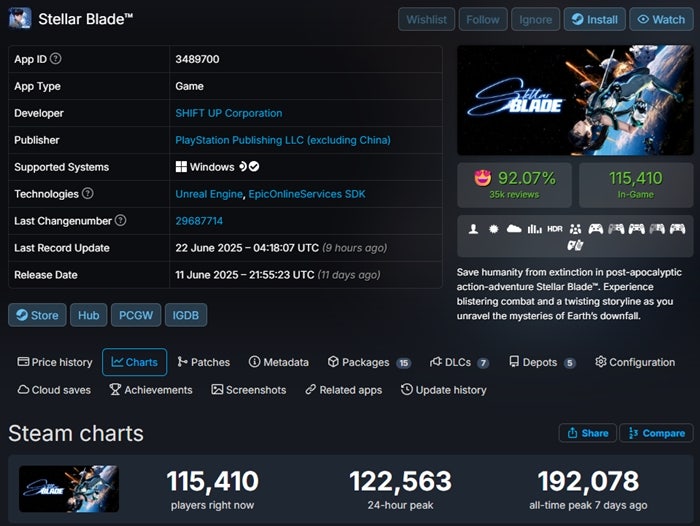 '스텔라 블레이드'가 최근 누적 판매량 300만장을 돌파했다는 소식이 화제입니다. PS5 독점 기간 중 콘솔 플랫폼에서도 충분히 좋은 성적을 거뒀지만 아무래도 최근 PC버전을 출시하고 자사 게임인 '승리의 여신: 니케'의 콜라보 DLC를 출시한 것의 영향이 크다는 분석이 많은데요. 실제로 출시 당일에 스팀을 기준으로 글로벌 매출 순위 1위를 달성하거나 20만에 가까운 최고 동접자수를 기록한 지표가 이러한 주장을 뒷받침하는 근거로 쓰이고 있습니다.