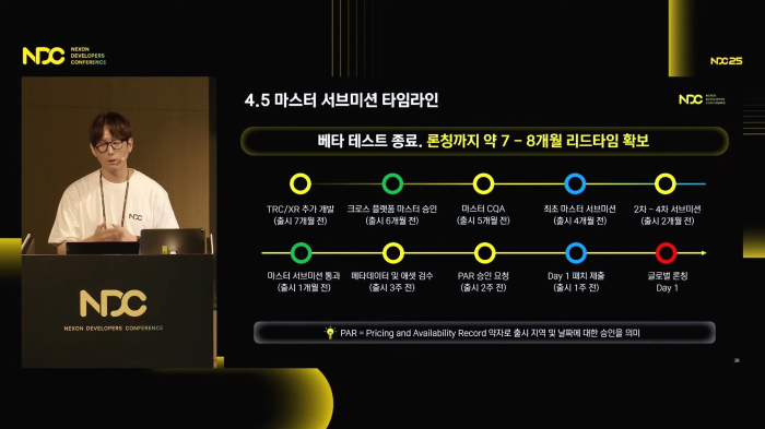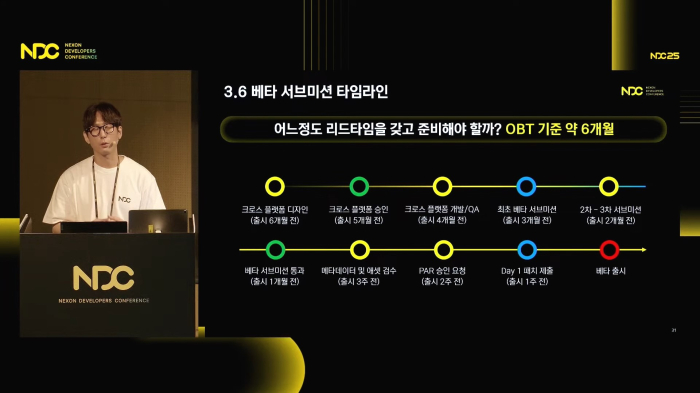발표자는 스케쥴을 관리하기 위해 출시일을 기준으로 마일스톤 및 액션 아이템을 역순으로 목록화하는 '워크백 스케쥴'에 따라 업무를 진행했다. 베타 서브미션은 OBT를 기준으로 약 6개월, 마스터 서브미션은 베타 테스트 종류 후 론칭까지 약 7~8개월 리드타임을 설정했다.