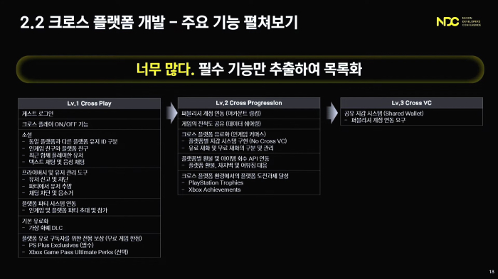 이번 세션에선 PC 게임만 담당하던 발표자가 카트라이더 드래프트와 퍼스트 디센던트 콘솔 크로스 플랫폼 론칭 과정에서 겪은 시행착오를 공유했다. 발표는 크로스 플랫폼 게이밍이란?, 크로스 플랫폼 개발, 어디서부터 시작해야 할까? 콘솔 검수의 첫걸음, 베타 서브미션 준비, 론칭의 마지막 관문, 마스터 서브미션 통과, 처음 도전하는 PM에게 전하는 메시지 5가지 소주제로 나누어 진행됐다.