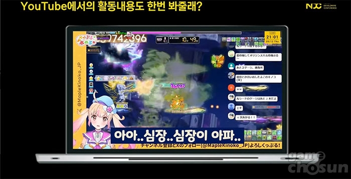 이날 오후 2023년부터 일본 '메이플스토리' 유저와의 커뮤니케이션 활성화를 위해 탄생한 커뮤니 매니저 버튜버 '메이플키노코짱'의 활용 사례를 전하기 위한 넥슨재팬 마케팅팀 '오주희' 리더와 넥슨재팬 키노코짱 디렉팅을 맞은 '스즈키 코우타'의 체험 사례를 전하는 발표에 가까운 강연이 진행됐다.