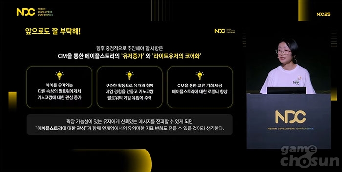 뿐만 아니라 오주희 리더는 키노코짱 활동의 긍정적인 성과와 부족한 부분을 짚어내며 현재 자신들이 더 노력해야할 부분과 강화시켜 나가할 부분을 짚어 소개했고, 특히, 이 과정에서 비주얼 액션의 시사성을 강화하고, 콘텐츠를 고도화하여 추후 수치적인 증가는 물론 공식에 대한 긍정적인 어프로치로 삼아 CM 활동을 통해 일본 메이플스토리 유저 증가와 라이트 유저의 코어화를 목표로 하고 있음을 분명히 했다.