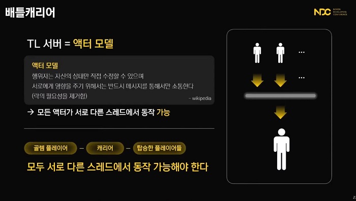 TL의 서버는 액터 모델을 행위자가 자신의 상태만 직접 수정할 수 있으며, 서로에게 영향을 주기 위해서는 반드시 메시지를 통해서만 소통하는 액터 모델을 활용했다. 덕분에 모든 액터가 서로 다른 스레드에서 적용된다. 서로 다른액터와 서로 다른 스레드로 동작하면서 마치 지구는 계속 움직이고 있지만 우리는 지구가 움직이고 있다는 사실을 직접 움직이지 않는 이상 인지 할 수 없는 것과 동일한 효과를 얻게 된다.